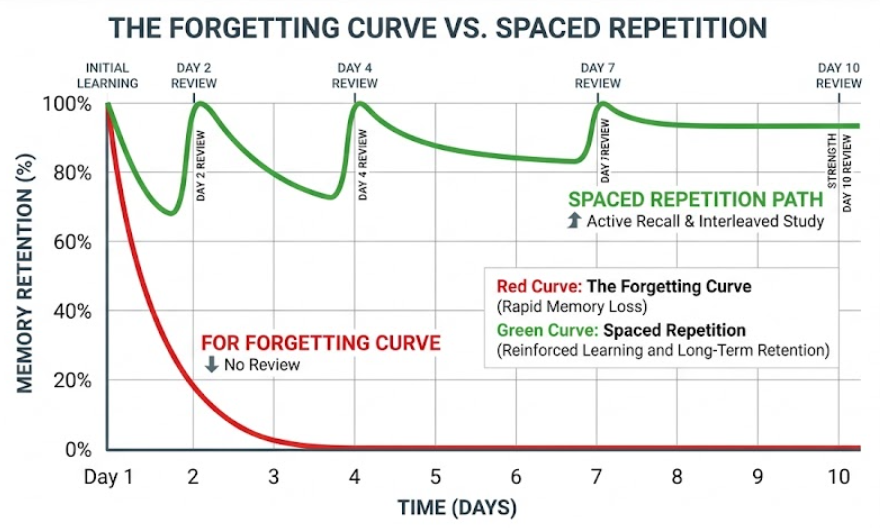 | Retention | Short-term (Cramming) | Long-term (Spaced Repetition) |